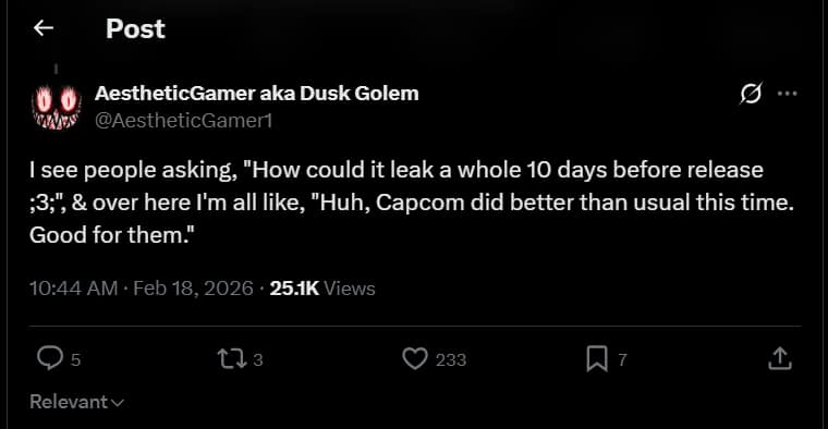 Another user made a sarcastic comment, saying that if the game only leaked 10 days before release, Capcom actually did better than usual.
