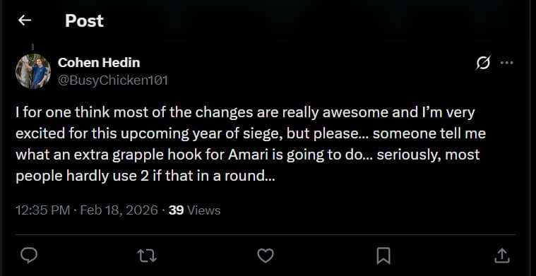 One user said they liked most of the changes and felt excited about the new year of Siege, but they were confused about giving Amaru an extra grapple hook, since many players do not even use two in a round.