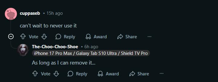 Another comment, “can’t wait to never use it,” uses irony to signal a lack of interest and anticipation—essentially expressing that the feature adds no practical value for them.